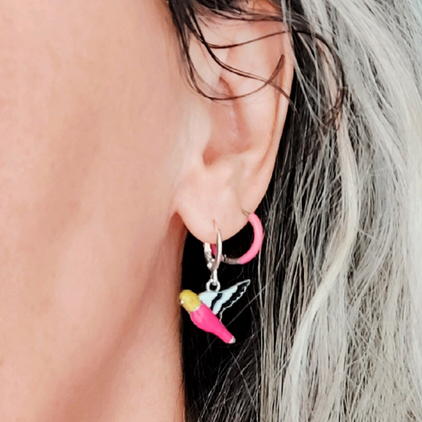 Zomers gekleurde vogeltjes oorbellen! De vogel is van gekleurd emaille, en de achterkant is zilver-of goudkleurig metaal.