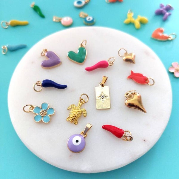 Rood met gouden bovenkantje. Er zit een stainless steel goudkleurig ringetje aan,waardoor je hem zowel aan een kettinkje,als aan een hoop oorbel kan hangen!