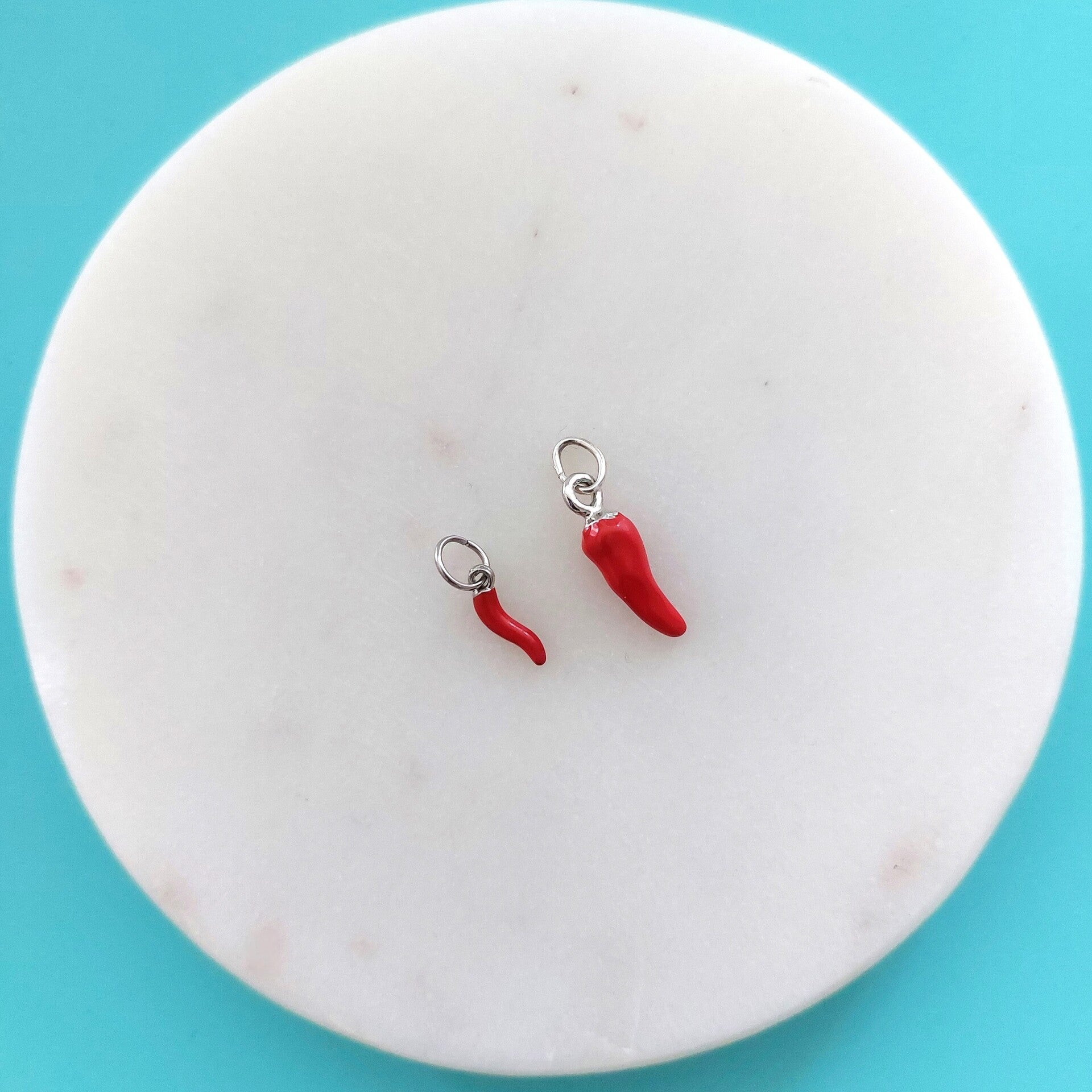 Rood met zilverkleurig bovenkantje. Er zit een stainless steel kleurig ringetje aan,waardoor je hem zowel aan een kettinkje,als aan een hoop oorbel kan hangen!